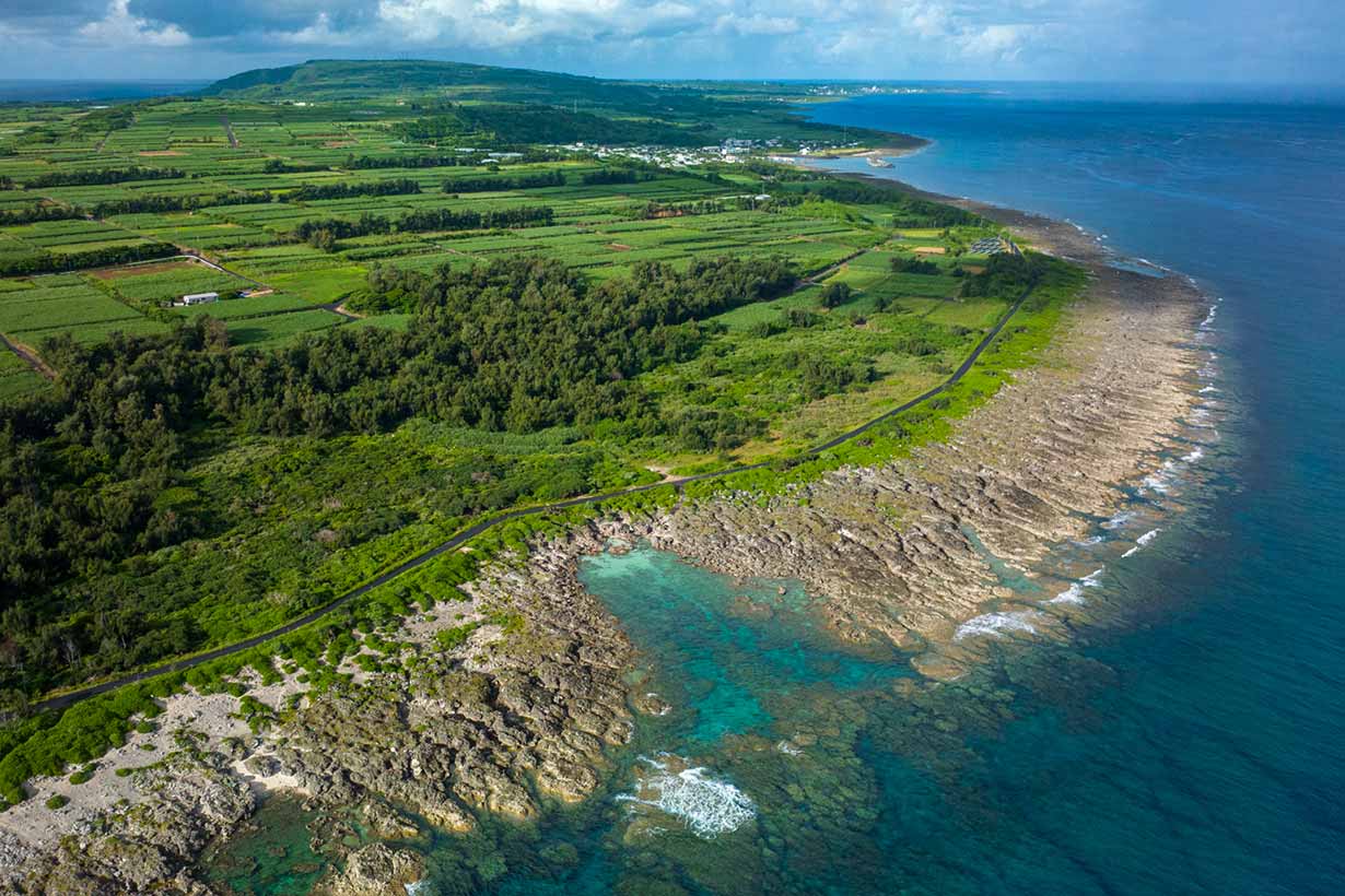 喜界島は鹿児島から南に約380km・奄美大島の東に約25km。太平洋と東シナ海のぶつかる東経130度00分の洋上に浮かぶ隆起珊瑚礁の島です。島の大半が隆起サンゴ礁で、今でも年間平均2mmという驚異的なスピードで隆起し続けており、学術的にも貴重な島です。人口は約6.5千人。総面積の約3分の1がサトウキビ畑。白ゴマの生産量日本一でもあります。